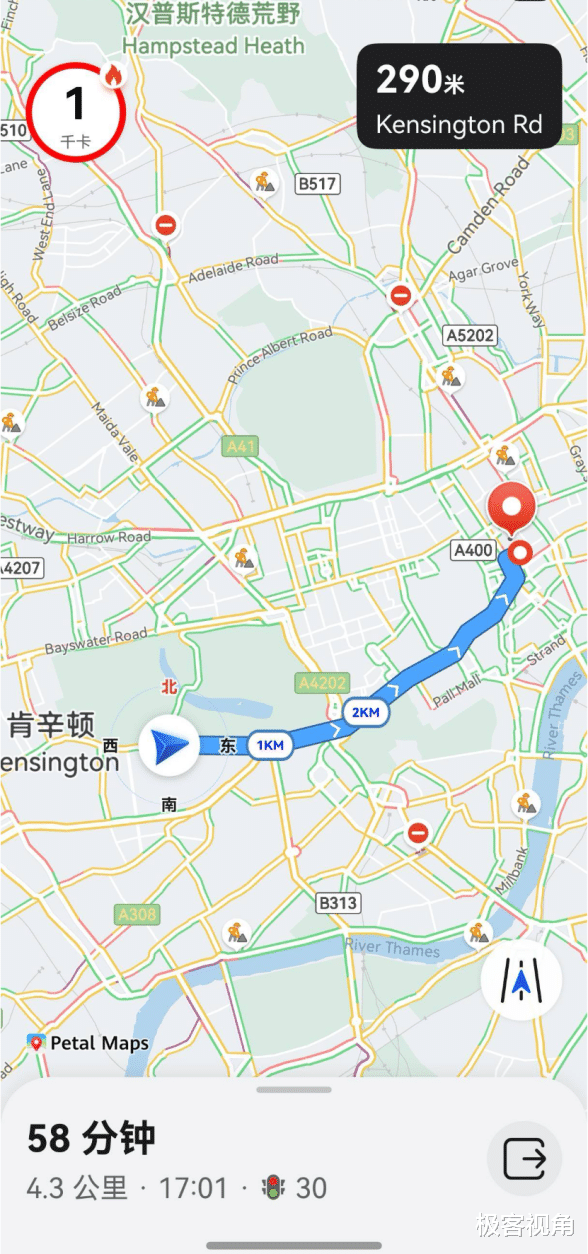 我骑着共享单车出发,总不能一直掏手机看导航吧?幸好花瓣地图支持手机手表协同导航,我直接把路线信息流转到了华为手表上。骑车的时候,根本不用看手机,一抬手腕,就知道该从哪个路口转弯,既安全又方便。